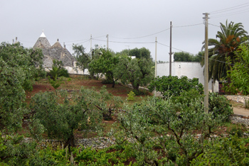Itālijas daba dara, ko spēj, lai mani pārsteigtu aizvien no jauna. Augļu dārzus, olīvu un vīnogu laukus stingrās līnijās norobežo kaļķakmenī veidoti žogi. Tie stiepjas gar ceļu malām, iebrauktuvēm, ganībām, nedaudz apdrupuši, apsūnojuši, bet tādēļ vēl jo gleznaināki. Kādas saimniecības teritorijā pamanu pirmo trulli mājiņu puduri. Pelēkie konusiņi braši slejas starp koku puduriem, vilinot braukt tuvāk. Mēģinu to darīt, bet izlīkumojot caur akmeņaino žogu stingri nosprausto trajektoriju nonāku privātmājas pagalmā. Neviena nemanīta lavos projām. Pēcāk izrādās, ka trulli jumtiņi rotā katru saimniecību, viens apdrupis un senatnīgs, cits pavisam jauns un dekoratīvs.