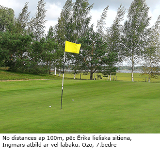 Nākamās divas bedrītes gan Ērika rēķinā - (1 down). Taču tad šūpoles atkal pretējā virzienā - Ēriks, pelnītiem aplausiem skanot, savu trešo sitienu no metriem simts uz 7. grīna nosēdina pusotru metru no karoga, bet Ingmārs atbild, noliekot savu bumbiņu vēl uz pusi tuvāk - kā rezultātā PAR. Uz konkrētās bedres - otro vai trešo reizi karjerā…