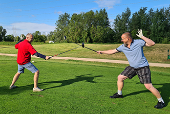 Linarda sitiens ar draiveri liek bumbiņai lidot pāri kalnam kreisajā pusē, savukārt Gundara sitiens - labajā pusē. Nedaudz veiksmīgākā pozīcijā atrodas Linards, un ar otro sitienu ir tur pat, kur Gundars ar trešo. Tālāk seko līdzīga spēle, lai nokļūtu uz grīna. Tad Gundaram veiksmīgāks un Linardam neveiksmīgāks mēģinājums tuvoties karodziņam……