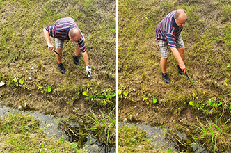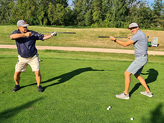 Linarda sitiens ar draiveri liek bumbiņai lidot pāri kalnam kreisajā pusē, savukārt Gundara sitiens - labajā pusē. Nedaudz veiksmīgākā pozīcijā atrodas Linards, un ar otro sitienu ir tur pat, kur Gundars ar trešo. Tālāk seko līdzīga spēle, lai nokļūtu uz grīna. Tad Gundaram veiksmīgāks un Linardam neveiksmīgāks mēģinājums tuvoties karodziņam……