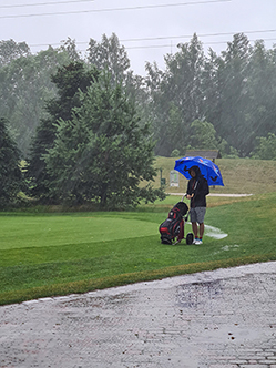 Jānim saulaini sekmējās pirmajās četrās bedrītēs, kur divi PARi un divi bugiji, par kādām negaisa vēsmām nebūt nevēstīja. Gundaram pirmajās divās bedrītēs sitieni ar dzelzi uz grīnu izkārtoja tādu situāciju, ka laikam pirmo reizi pārdesmit gadu karjerā raunds tika sākts ar diviem PAR. Trīskāršs bugijs turpinājumā 3.bedrītē gan palīdzēja tābrīža līderim tikt vaļā no nervozām domām un mentālās veselības apdraudējuma. Ēriks golfa dienu sāka ar astotnieku, sekoja bugijs un divkāršs bugijs, bet PARs 4.bedrītē vedināja domāt, ka viss labākais vēl tikai gaida.